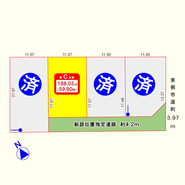 全4区画残り1区画、土地面積約60坪の大型分譲地です。造成宅地なので即建築可能、上下水道管引込済み。建築条件のない宅地分譲のためお好みのハウスメーカー・工務店で建築可能です。